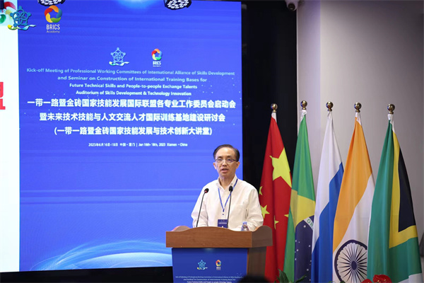 近日,一帶一路暨金磚國家技能發(fā)展國際聯(lián)盟各專業(yè)工作委員會啟動會暨未來技術(shù)技能與人文交流人才國際訓(xùn)練基地建設(shè)研討會在廈門成功舉辦。教育部中外人文交流中心副主任夏娟,一帶一路暨金磚國家技能發(fā)展國際聯(lián)盟理事長、廈門市金磚未來技能發(fā)展與技術(shù)創(chuàng)新研究院院長劉振英出席會議并致辭。廈門市教育局副局長洪軍、廈門市人社局副局長彭新良、教育部中外人文交流中心機制工作二處處長陳滔偉、廈門市教育局高教職教處處長陳哲新、中國交通教育研究會副會長楊澤宇、教育部中外人文交流中心機制工作二處張馨心、廈門市金磚辦代表沈麗瓊、廈門火炬管委會代表蔡坤海、廈門市集美區(qū)人民政府代表于淑雅出席會議。來自全國82所院校、18家企業(yè)和社會團體的200多名領(lǐng)導(dǎo)和專家現(xiàn)場參會。