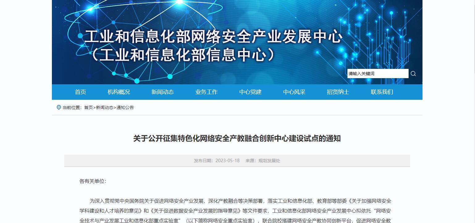 為深入貫徹黨中央國務(wù)院關(guān)于促進網(wǎng)絡(luò)安全產(chǎn)業(yè)發(fā)展、深化產(chǎn)教融合等決策部署,落實工業(yè)和信息化部、教育部等部委《關(guān)于加強網(wǎng)絡(luò)安全學(xué)科建設(shè)和人才培養(yǎng)的意見》和《關(guān)于促進數(shù)據(jù)安全產(chǎn)業(yè)發(fā)展的指導(dǎo)意見》等文件要求,工業(yè)和信息化部網(wǎng)絡(luò)安全產(chǎn)業(yè)發(fā)展中心擬依托“網(wǎng)絡(luò)安全技術(shù)與產(chǎn)業(yè)發(fā)展工業(yè)和信息化部重點實驗室”(以下簡稱網(wǎng)絡(luò)安全重點實驗室),聯(lián)合院校搭建網(wǎng)絡(luò)安全產(chǎn)教協(xié)同創(chuàng)新平臺,促進網(wǎng)絡(luò)安全教育資源協(xié)同整合,推動網(wǎng)絡(luò)安全“新工科”應(yīng)用型人才培養(yǎng),為國家網(wǎng)絡(luò)強國建設(shè)提供人才支撐。網(wǎng)絡(luò)安全重點實驗室現(xiàn)面向普通高等院校和職業(yè)院校公開征集特色化網(wǎng)絡(luò)安全產(chǎn)教融合創(chuàng)新中心建設(shè)試點單位,現(xiàn)將相關(guān)事項通知如下: