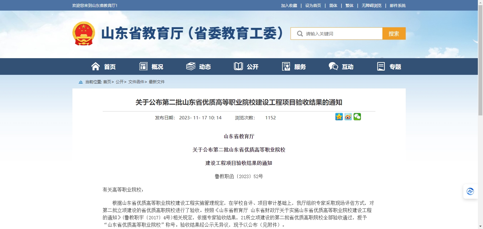 近日,山東省教育廳發(fā)布《關(guān)于公布第二批山東省優(yōu)質(zhì)高等職業(yè)院校建設(shè)工程項(xiàng)目驗(yàn)收結(jié)果的通知》,按照《山東省教育廳 山東省財(cái)政廳關(guān)于實(shí)施山東省優(yōu)質(zhì)高等職業(yè)院校建設(shè)工程的通知》(魯教職字〔2017〕4號(hào))相關(guān)規(guī)定,依據(jù)專家驗(yàn)收結(jié)果,21所立項(xiàng)建設(shè)的第二批省優(yōu)質(zhì)高職院校全部驗(yàn)收通過(guò),授予“山東省優(yōu)質(zhì)高等職業(yè)院校”稱號(hào)。