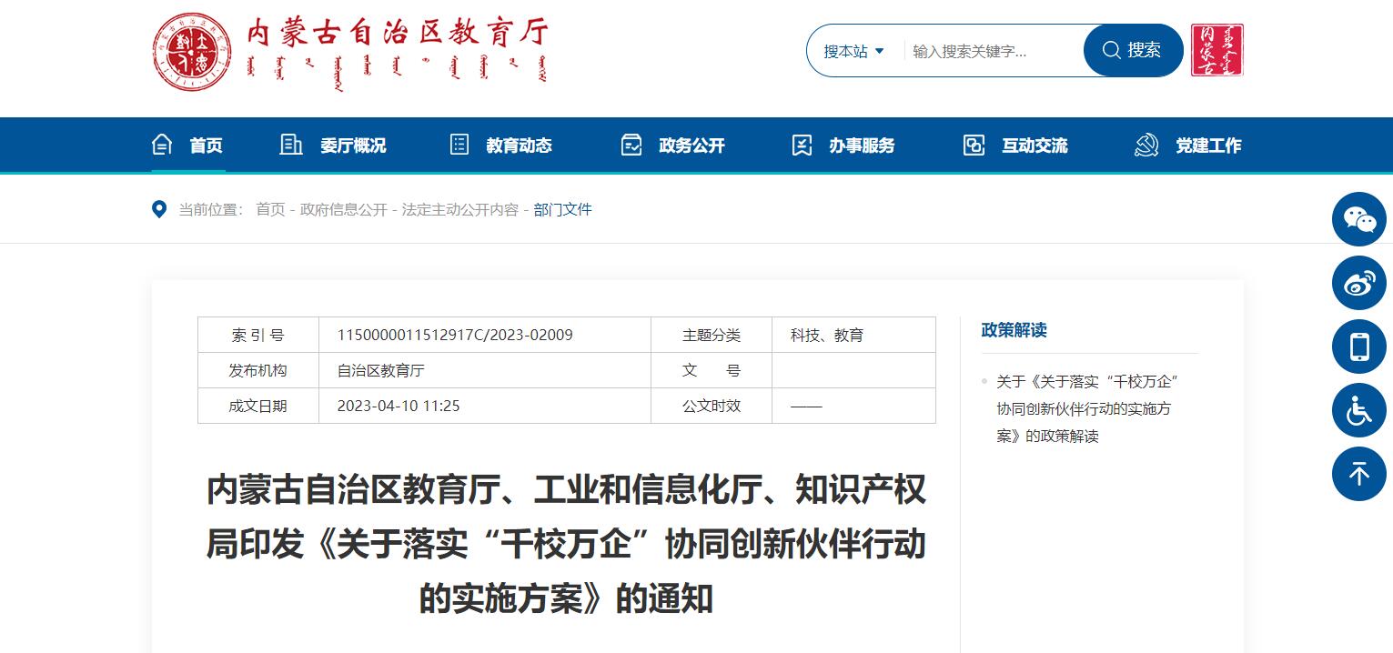 內(nèi)蒙古自治區(qū)教育廳等3部門聯(lián)合印發(fā)《關(guān)于落實(shí)“千校萬企”協(xié)同創(chuàng)新伙伴行動(dòng)的實(shí)施方案》