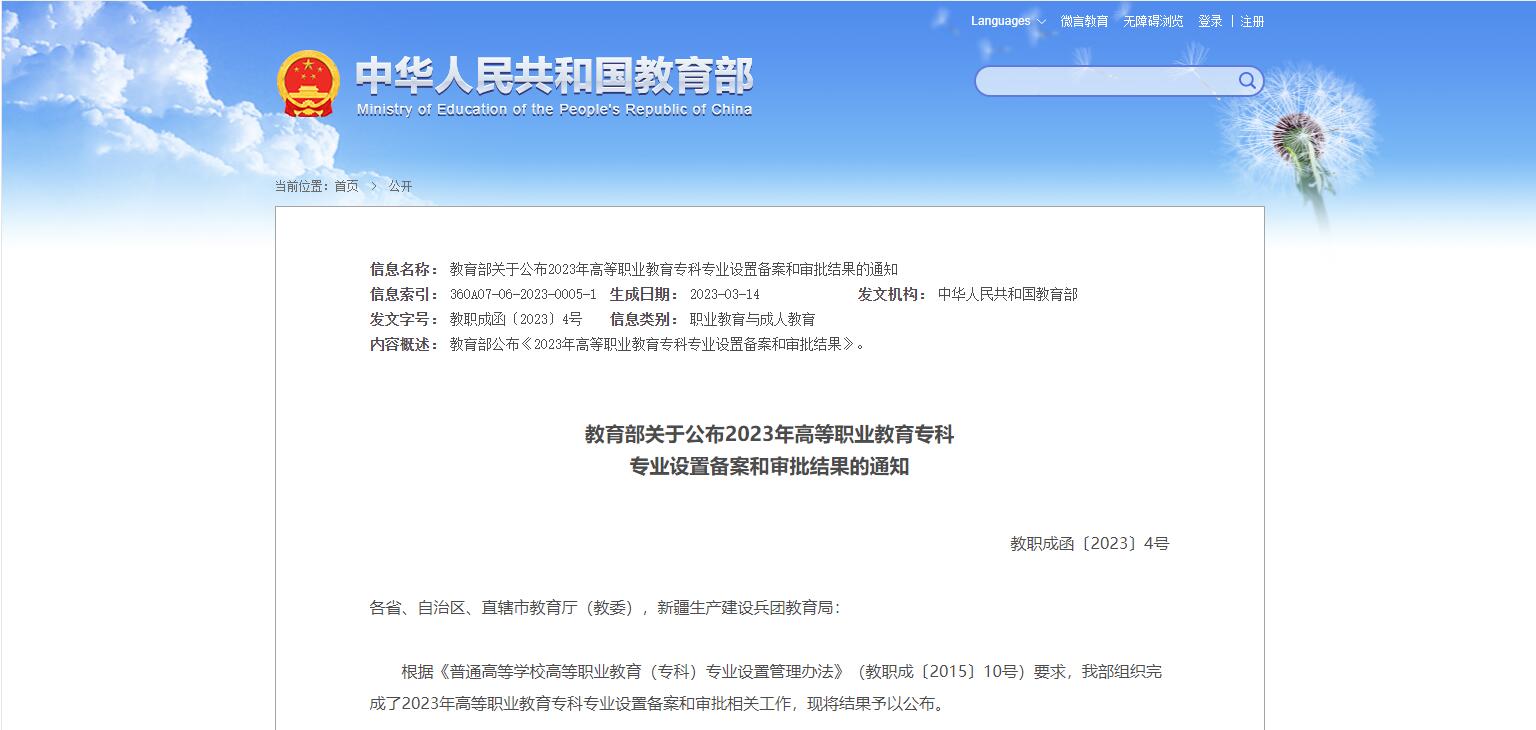 日前,教育部組織完成了2023年高等職業(yè)教育專(zhuān)科專(zhuān)業(yè)設(shè)置備案和審批相關(guān)工作,并公布結(jié)果,經(jīng)省級(jí)教育行政部門(mén)備案并在教育部匯總的2023年擬招生專(zhuān)業(yè)點(diǎn)共65808個(gè),備案結(jié)果可在全國(guó)職業(yè)院校專(zhuān)業(yè)設(shè)置管理......